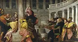 Asi krátce po příchodu Paola Veronesa do Benátek vznikl obraz Dvanáctiletý Ježíš mezi učenci, v němž se spojuje původní malířův veronský styl s poučením na benátské malbě vrcholné renesance, především poučení na Tizianových obrazech. Dokládá to tento Paolův obraz namalovaný mezi roky 1558 a 1560. Malíř na něm zobrazil diskutujícího dvanáctiletého Ježíše na vyvýšeném místě Jeruzalémského chrámu, zatímco divák, podobně jako vyobrazení učenci a farizeové, jsou na úrovni účastníka události, tj. v podhledu vůči Ježíšově postavě. Tento způsob malby „zdola nahoru“ Paolo často používal i později, podobně jako vyobrazení antického sloupořadí či bohatě zdobených barevných oblečení typických pro oděvy benátských obchodníků.[11] Všechny tyto charakteristické rysy Paolovy malby pak nalezneme na jeho několika velkoplošných vyobrazeních hostin namalovaných mezi roky 1562/63 a 1572/73.