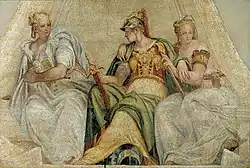 Minerva mezi Geometrií a Aritmetikou (1551, fragment fresky z Villa Soranzo; dnes v Palazzo Balbi, Benátky)