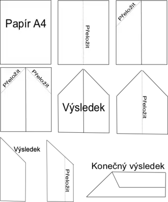 - Stále v pozici nastojato by měl ohnout přesně nespecifikovanou část kratší boční strany (ale pouze jeden list) tak, aby vzniklá hrana byla rovnoběžná s hlavním záhybem. Poté je třeba papír otočit a stejnou operaci provést na druhé straně. Různé varianty tohoto základního papírového letadla, odlišné konstrukce než zde popsané, lze nalézt spolu s instrukcemi na webu Kena Blackburna.