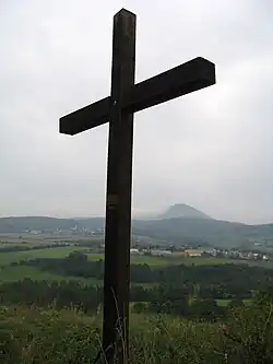 Kříž na vrcholu kopce, v pozadí vesnice Žalany a Bořislav a hora Milešovka