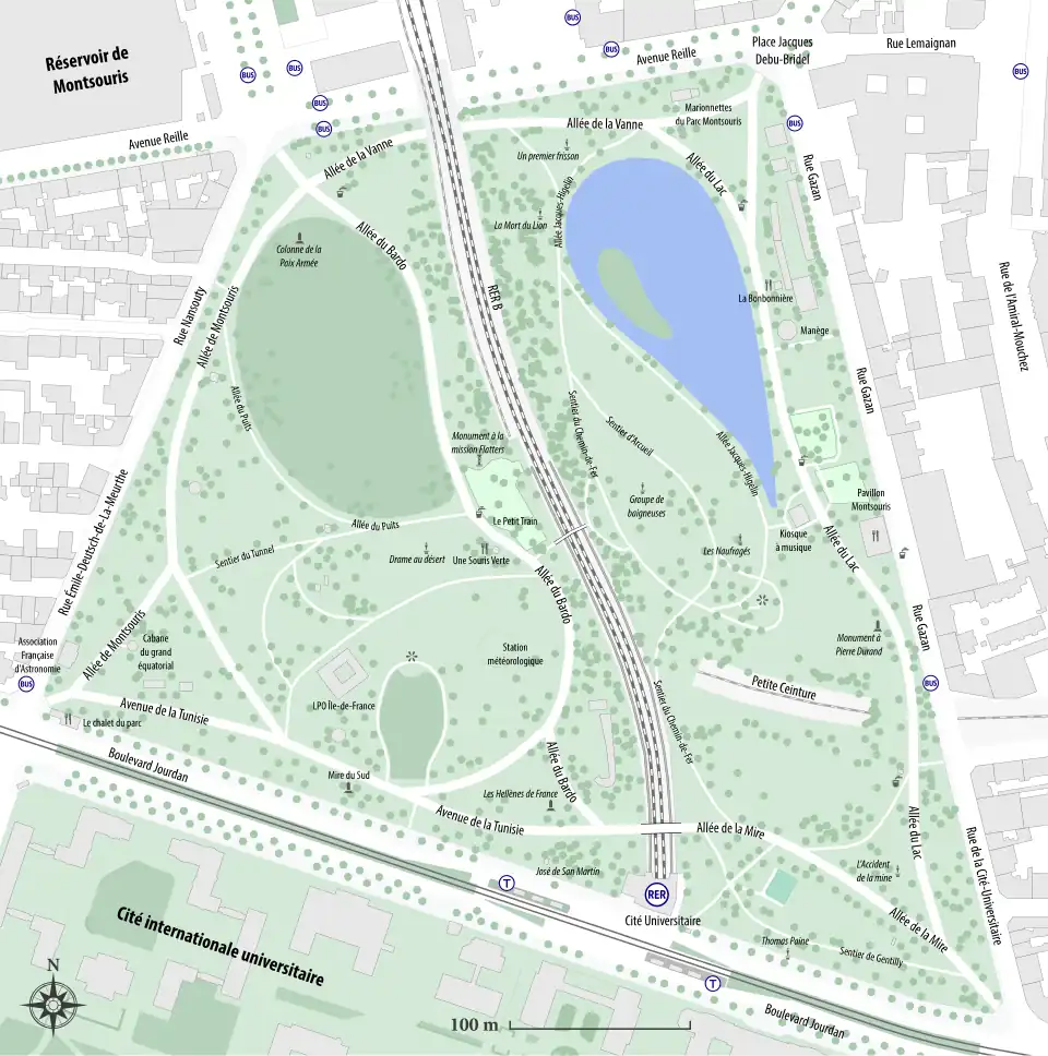 - Na jižním okraji parku se nachází stanice RER Cité Universitaire. Jedná se o stanici zaniklé železniční tratě, která je od roku 1977 využívána pro linku RER B, a která rozděluje v zahloubeném příkopu park na dvě poloviny. Přes železnici vedou dvě pěší lávky. Od roku 2006 je zde možné přestoupit na tramajovou linku T3, která vede po Boulevardu Jourdan.