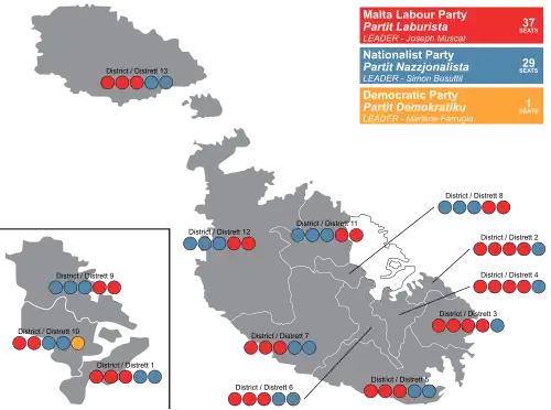 - Labouristická strana (PL) úřadujícího předsedy vlády Josepha Muscata obhajovala většinu v zákonodárném sboru.