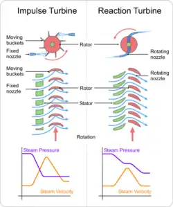 Pro zvýšení účinnosti bývají obvykle velké parní turbíny rozděleny na několik dílů – stupňů, vysokotlaký a nízkotlaký stupeň, případně i středotlaké stupně. Mezi nimi může být i regenerátor páry, který znovu ohřeje expanzí zchladlou páru, čímž zvětší (za cenu dodání relativně malé energie) její objem.