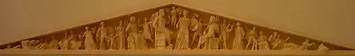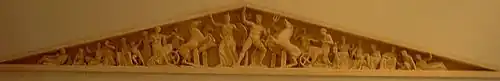 Roh východního štítu Parthenonu s vsazenými kopiemi soch