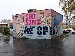 - God Saves, We spend, mural, v rámci akce Praha 11 Streetart, Praha-Jižní Město