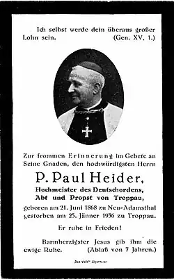 - Alfons Jedelsky: Paul Heider (1868–1936). Propst von Troppau, Hochmeister des Deutschen Ordens. In: Kirche, Recht und Land. Festschrift, Weihbischof Prof. Dr. Adolf Kindermann dargeboten zum 70. Lebensjahre im Auftrage des Sudetendeutschen Priesterwerkes und der Ackermann-Gemeinde von Mons. Dr. Karl Reiß und Staatsminister a. D. Hans Schütz. Königstein/Ts.-München 1969, s. 262–268.