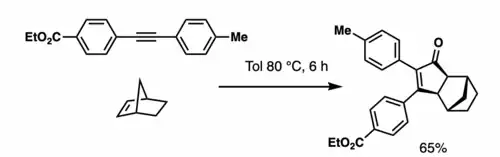 Reakci lze provést jak u koncových, tak i u vnitřních alkynů, i když v případě vnitřních bývají výtěžky nižší. Reaktivity alkenů klesají podle této řady: . Pro reakci nejsou vhodné tetrasubstituované alkeny a alkeny obsahující skupiny vyznačující se silným odtahováním elektronů.[13]