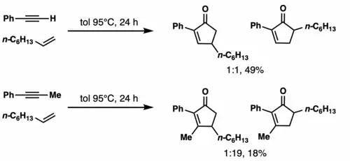 Pausonovy–Khandovy reakce využívající nesymetrické alkeny či alkyny nemívají výraznou regioselektivitu; o něco lépe jsou na tom vnitromolekulární varianty.[14]