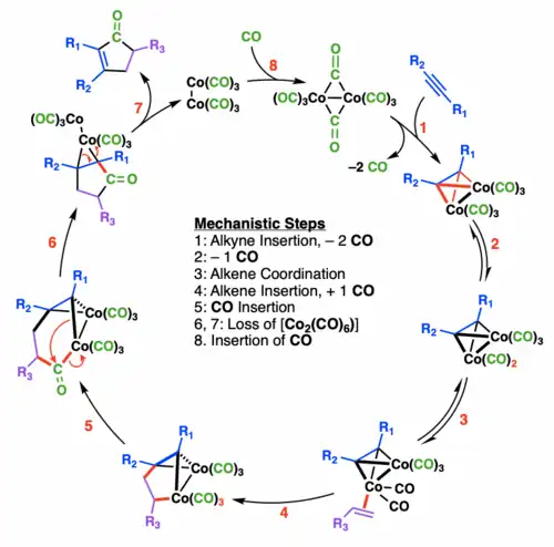 Na začátku se vytvoří hexakarbonylacetylenový komplex dikobaltu. Navázáním alkenu vznikne metalacyklopentanový komplex. Poté se CO naváže na vazbu kov-uhlík. Redukční eliminace vede k cyklopentenonu. Krokem určujícím rychlost je obvykle odštěpení oxidu uhelnatého z organokovového meziproduktu.