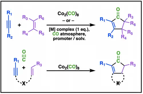 Při reakci se původně používala stechiometrická množství oktakarbonylu dikobaltu, ale později byly nalezeny varianty vykazující lepší reaktivitu a vyšší výtěžnosti, Tyto obměny využívají chirální pomocníky k dosažení stereoindukce, přechodné kovy (Ti, Mo, W, Fe, Co, Ni, Ru, Rh, Ir a Pd) a různé příměsi.[7][8][9]