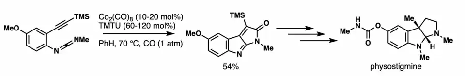 Při totální syntéze fysostigminu byla použita Pausonova-Khandova reakce karbodiimidu.[52][53]
