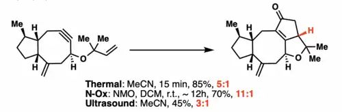 I když měla reakce s použitím N-oxidu nižší výtěžnost, tak vytvářela požadovaný diastereomer (na následujícím obrázku s červeným vodíkem) v poměru 11:1 oproti druhému; ostatní postupy, využívající například zvýšení teploty nebo ultrazvuk, byly méně účinné.