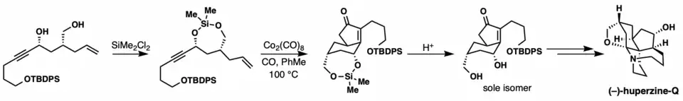 Vnitromolekulární Pausonovy–Khandovy reakce lze použít na cyklizaci enynů obsahujících terc-butyldifenylsilylové chránicí skupiny na primárních hydroxylech.[48] Takto byl proveden jeden z kroků asymetrické totální syntézy alkaloidu huperzinu-Q. Tvorby potřebné konformace se dosáhlo díky navázání cyklické siloxanové skupiny na substrát[49] – vznikal tak jediný enantiomer.[48]