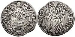 Stříbrňák ražený v Římě za pontifikátu Pavla IV. v r. 1555