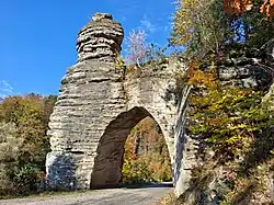 Brána ve směru od Lažan, vpravo schodiště pro výstup na bránu.