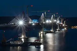 Stavební práce byly zahájeny roku 2019. Musela být provedena řada dodatečných vrtů pro ukotvení jednotlivých pylonů.[13] V lednu téhož roku byl usazen první pylon na místo. Dne 11. dubna 2019 byla dokončena první fáze výstavby, kterou tehdejší chorvatský premiér Andrej Plenković oznámil na zasedání formátu Čína+16. Odhalena zde byla pamětní deska.