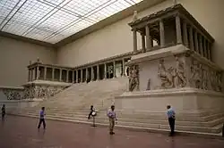 Pergamonský oltář – Velký oltář vybudovaný na terase akropole v Pergamonu okolo roku 170 př. n. l. Eumenem II. K oltáři patří i vystavené vlysy znázorňující zápas bohů a gigantů (gigantomachie), symbolizující boj mezi pergamskými Řeky a barbarskými Galaty. Oltář byl odkryt pruskou expedicí v průběhu tří sezón vykopávek (1878-1886). Vystavená část je pouze jednou dochovanou částí původně čtvercové stavby.
