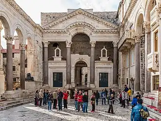 V římských dobách bylo monumentální prostranství důležitým místem. Peristyl představoval severní vchod do soukromých místností císaře. Do něj se vstupovalo přes tzv. vestibul (též později označovaný jako Rotunda). Z prostranství byl také přístup do sklepení Diokleciánova paláce, k jeho mauzoleu na východě (které se změnilo v průběhu staletí do podoby dnešní katedrály sv. Domnia) a ke třem antickým chrámům, z nichž jeden, Jupiterův chrám (nyní chrám sv. Jana Křtitele), se zachoval.