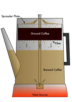 - Voda cirkuluje skrz kávu (je tlačena nahoru a pak stéká vlivem gravitace), dokud není dosažena požadovaná „síla“ vařené kávy.[2]