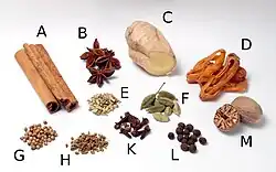 Perníkové koření: skořice (A), badyán (B), zázvor (C), muškátový květ (D), fenykl (E), kardamom (F), koriandr (G), anýz (H), hřebíček (K), nové koření (L) a muškátový oříšek (M)