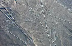 Geoglyfy na náhorní plošině Nazca tvoří více než 300 obrazců, tvořených světlými liniemi, vzniklými odstraněním tmavšího vulkanického povrchu. Jednotlivé obrazce jsou zřetelné až při pohledu z letadla nebo balonu a dodnes není jednoznačně prokázáno, z jakého důvodu byly vytvořeny.[38]