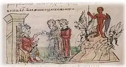 | „ | ...Když přišel, rozkázal povalit modly, jedny rozsekat, druhé vydat ohni. Peruna rozkázal přivázat koni k ocasu a vléci jej do Boričevu k potoku; určil dvanáct mužů, aby ho bili holemi. To ne proto, že by to dřevo cítilo, ale na potupu běsu, který tou podobou oklamal lid, a aby přijal od lidí odplatu. ‚Veliký jsi, Hospodine, a podivuhodné jsou skutky Tvé‛ Včera lidmi ctěný, dnes potupený. Když ho dovlekli, hodili ho do Dněpru. Ustanovil Vladimír (některé) a řekl (jim):‚Jestliže někde přistane, odstrkujte ho od břehu, dokud neprojde skrze prahy: potom ho nechte.‛ Oni vykonali rozkaz. Jakmile je opustil a prošel skrze prahy, vyvrhl ho vítr na písčinu, od toho byla nazvána Perunovou písčinou a tak se i jmenuje do dnešního dne...[3] | “ |