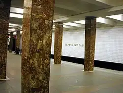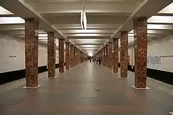 Obklad stěn za nástupištěm je z bílých dlaždic, u sloupů pak růžový mramor. Sloupy jsou čtyřboké a směrem k podlaze se zužují.