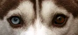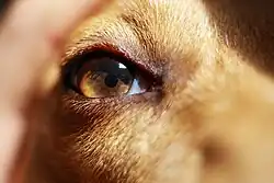 Na úrovni stopu jsou umístěné oči. Pes má kulatou zornici a duhovku, která je u většiny plemen psů hnědá, ideálně tmavohnědá. U jiných plemen je povolená barva světle hnědá, jantarově žlutá, modrá, nebo i nestejně zbarvené oči. Ve vnitřním koutku oka se nachází třetí oční víčko, spojivkou pokrytá chrupavčitá ploténka, která chrání oko před případnými cizími tělesy, jako je prach nebo písek. U zdravého oka je třetí víčko nenápadné.