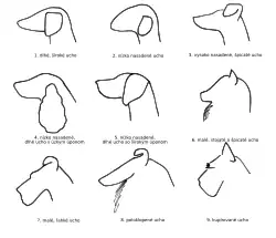 Původním tvarem hlavy je hlava klínovitá, též vlčí. Čenichová partie postupně směrem k čenichu zužuje. Je typická pro německé ovčáky, špice, šiperku, kolie a mnoho dalších. Hlava hranatá je charakteristická kratší čenichovou partií, která se nezužuje. Je mohutná, s patrnými lícními kostmi. Hranatou hlavu mají například molossoidní plemena nebo americký pitbulteriér. Kulatou hlavu mají malá společenská plemena, jako je opičí pinč nebo shih-tzu. Speciálně u čivavy se navíc vyžaduje vypouklé čelo a hlava tzv. jablkovitá. Vejčitá hlava je charakteristickým znakem anglického bulteriéra.[64]