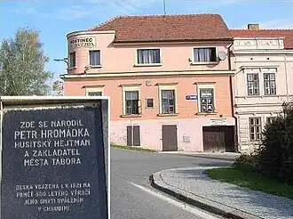 Zde se narodil Petr Hromádka husitský hejtman a zakladatel Tábora. Deska vsazena 1. v. 1921 na paměť 500 letého výročí jeho smrti upálením v Chrudimi.