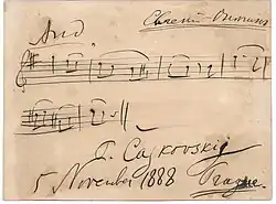 Vlastnoruční notový záznam Čajkovského s jeho podpisem z roku 1888, kdy v Praze dirigoval svoji operu Evžen Oněgin.