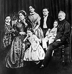 Čajkovského rodina v roce 1848: Sedící rodiče s Alexandrou a Hyppolitem, stojící zleva Petr, Zinajda a Nikolaj