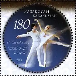 Poštovní známka Kazachstánu znázorňující Labutí jezero