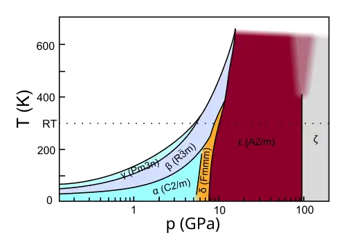 - δ-fáze: oranžová — vzniká za laboratorní teploty při tlaku 9 GPa