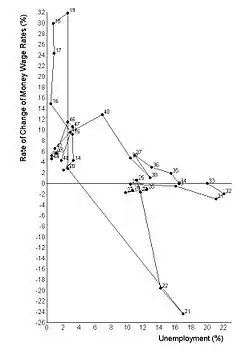 - ↑ Phillips, A. W. (1958). "The Relationship between Unemployment and the Rate of Change of Money Wages in the United Kingdom 1861-1957". Economica. 25 (100): 283–299.[1]