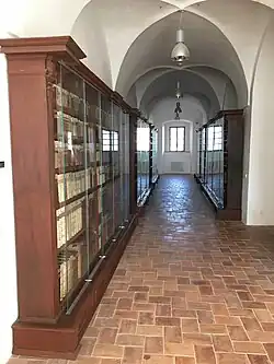Ve spojující chodbě severovýchodního křídla a přístavby našla své umístění v dobových barokních skříních původní knihovna litomyšlské piaristické koleje. Mimořádně komplexní a téměř v ucelené podobě dochovaný knihovní fond, systematicky budovaný od 17. století, byl po roce 1989 navrácen řádu a čítá více než 4000 svazků z oblasti přírodních i humanitních věd, nachází se zde však i beletrie.[9]