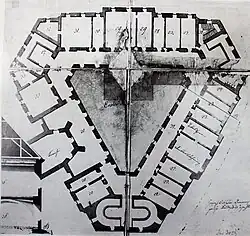 Stavba se v úplnosti nezachovala. Přesný obrázek o ní podává zaměřovací nárys J. W. Ehemanna z roku 1795, a dále perokresba S. Vydry z konce 18. století, zachycující podobu celého zámeckého areálu.[4] Santini v koncepci půdorysu užil motiv rovnoramenného trojúhelníka jako symbolu Nejsvětější Trojice. Na osách severní a jižní strany vystupovaly trojosé rizality, západní strana přiléhala k presbytáři kostela. Strany měly okosené vrcholy a na krajích konkávně projmuté jednoosé ústupky. Celá křídla byla jedenáctiosá. Hlavní portál byl v jižní ose a navazoval na vstupní halu s eliptickým dvojramenným schodištěm. Další dvojice schodišť se nacházela analogicky ve dvou zbývajících osách (ta však byla pravoúhlá). Nádvoří propojovala klenutá trojúhelná chodba. Dvoutraktové budova měla koutová pole vnitřní chodby na šestiúhelném půdorysu, typickém pro Santiniho tvorbu.[1] Celá stavba byla dvoupatrová se suterénem, který na severozápadě vystupoval ve svahu nad terén.[1] Jediná dochovaná část přiléhá k presbytáři kostela, se kterým je v rámci zámeckého areálu chráněna jako kulturní památka České republiky.[5]