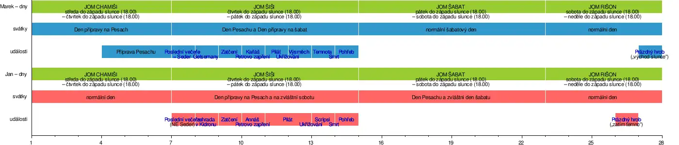 Přibližné chronologické srovnání vyprávění o umučení Ježíše podle Markova a Janova evangelia. Každý úsek ('1' až '28') představuje 3 hodiny času.[19]
