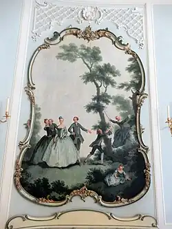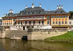 Přestavba byla provedena podle návrhu Matthäuse Daniela Pöppelmanna v barokním až rokokovém stylu. Vodní palác a jeho zrcadlový obraz horní palác, byly postaveny podle vzoru bran do císařského paláce v Pekingu (3 spojené pavilony), ale také benátských a římských vil. Zároveň bylo postaveno schodiště k řece a chrám Venuše v parku. Dílem stavitele Pöppelmanna je i malý kostel Weinbergkirche v nedalekých vinicích. Druhým známým architektem, který se na stavbě zámku podílel, byl Zacharias Longuelune, který dodal francouzské klasicistní prvky a obdélníkové tvary architektuře a zajistil rokokové malby šlechtických her v interiéru (Hra na slepou bábu, Houpačka, Milostné vyznání, aj.).