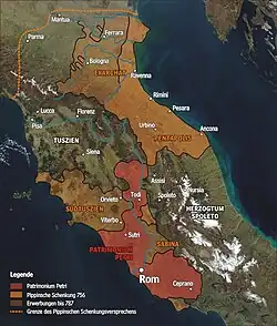 V roce 751 hrozilo dobytí Říma langobardským králem Aistulfem. Štěpán II. se proto obrátil na franckého panovníka Pipina III. Krátkého. Výměnou za pomazání na krále Pipin dvakrát, v letech 754 a 756, vytáhl proti Langobardům a dobytá území – Řím, Ravennu a Pentapolis (Rimini, Pesaro, Ancona, Fano a Senigallia) – odevzdal roku 755 papeži.[1] Tím oficiálně vznikl samostatný papežský stát, předchůdce dnešního Vatikánu.[2]