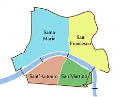 Od 15. st. bylo město rozděleno na čtyři části, čtvrtě a pojmenováno dle hlavního kostela v dané oblasti. Severozápadní část s Piazza dei Miracoli a hlavním náměstím Piazza dei Cavalieri je pojmenovaná dle dómu (Duomo di Santa Maria Assunta) Santa Maria, severovýchodní část dle stejnojmenného kostela San Francesco. Na levém břehu řeky Arno, na jihozápadě, leží Sant'Antonio, na jihovýchodě San Martino. Střed historického města pak leží na zmíněném Piazza dei Cavalieri. Zdejší paláce dei Cavalieri a del Orologio postavil slavný renesanční architekt Giorgio Vasari kolem 1560.