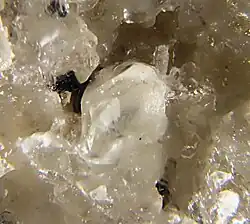 Je bezbarvý, vryp bílý, lesk skelný. Opticky jednoosý (-), No=1.508, Ne=1.506.