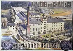 V roce 1874 založil v Hanušovicích sládek Josef Mullschitzký moderní parní pivovar. Společnost, která jej provozovala dostala název „Brauerei von Mullschitzký & Comp. zu Hannsdorf – Halbseit“. 28. prosince 1874 byla slavnostně uvařena první várka piva.[1] V prvním roce měl pivovar výstav celkem 15 900 hl piva. V roce 1882 změnil pivovar obchodní název na „Brauerei von Chiari & Co. zu Hannsdorf – Halbseit“. Od roku 1886 byl výstav již 23 006 hl piva. V roce 1907 došlo ke sloučení pivovarů Hanušovice, Šumperk a Třemešek do jednoho hospodářského subjektu. Nová společnost nesla název „Nordmährische Brauerei und Malzfabrik, Aktiengesellschaft in Mährisch Schönberg“. V letech 1910–1911 dosáhla tato společnost ročního výstavu 110 580 hl.