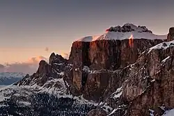 Zimní pohled na skupinu Sella od jihu, zleva doprava věže Sella, Piz de Ciavazes, soutěska Lorenz a Piz Lasties; pozdní odpoledne.