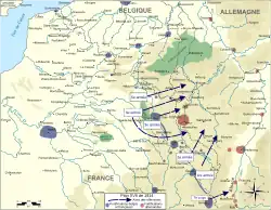 Francouzské velení postupovalo dle Plánu XVII na počátku první světové války, kdy podniklo výpad na německé území. Francouzský postup však nahrával německému plánu, který počítal s obchvatem francouzských pozic skrze území neutrální Belgie. Francouzi byli poraženi v bitvě o Ardeny, u Mylhúz a u Charleroi. Rychlý německý postup pak donutil Dohodu na západní frontě ustoupit až do blízkosti Paříže, kde teprve se Němce podařilo zastavit v bitvě na řece Marně.