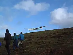 Pokud pilot při přeletu nenajde včas vhodný stoupavý proud, nezbývá mu, než provést přistání do terénu. Nedá se mluvit o nouzovém přistání, jedná se o rutinní proceduru, kdy si pilot vybere vhodnou plochu pro bezpečné přistání. Po přistání je větroň demontován (konstrukce větroně je uzpůsobena tak, aby tato demontáž byla co nejsnadnější) a odvezen zpět na letiště na speciálním transportním přívěsu za automobilem. Pokud je plocha dostatečně velká a s dostatečně pevným povrchem, je možno provézt vzlet za vlečným letadlem schváleným pro vleky z polí přímo z terénu.