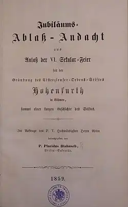 - BLAHUSCH, Placidus. Jubiläums-Ablaß-Andacht aus Anlaß der VI. Sekular-Feier seit der Gründung des Cisterzienser-Ordens-Stiftes Hohenfurth in Böhmen, sammt einer kurzen Geschichte des Stiftes. Linz: [s.n.], 1859. 47 s. (německy)