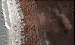Pozorování HiRISE z února 2008 zachytilo čtyři laviny při pádu ze 700 m vysokého útesu. Oblak prachu je široký 180 ma táhne se 190 m od základny útesu. červené vrstvy jsou skály bohaté na vodní led a bílé vrstvy jsou sezónní led oxidu uhličitého. Sesuv vznikl v nejvyšších vrstvách červených vrstev. Následující pozorování mají přinést informace o složení úlomků z tohoto sesuvu.