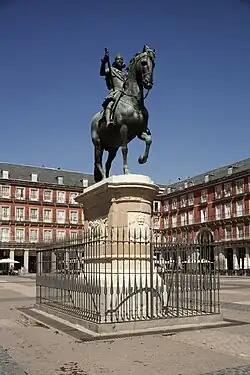 Uprostřed náměstí stojí bronzová jezdecká socha krále Filipa III. z roku 1616, kterou společně vytvořili Giambologna a Pietro Tacca.
