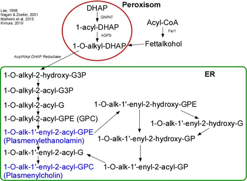 Biosyntéza plazmalogenů probíhá v peroxizomech a v endoplazmatickém retikulu. Vedlejší obrázek ilustruje složitost tohoto procesu pro dva plazmalogeny.